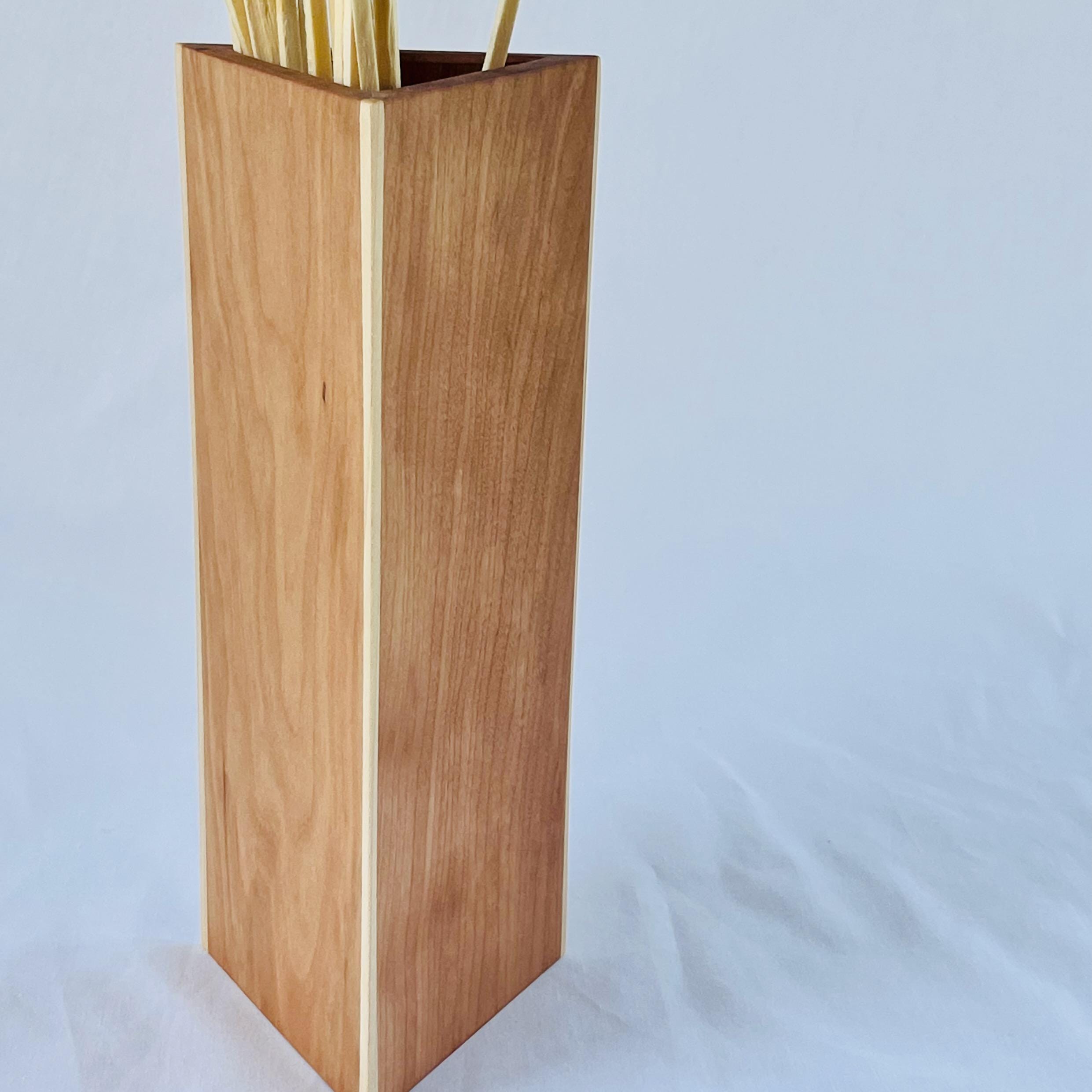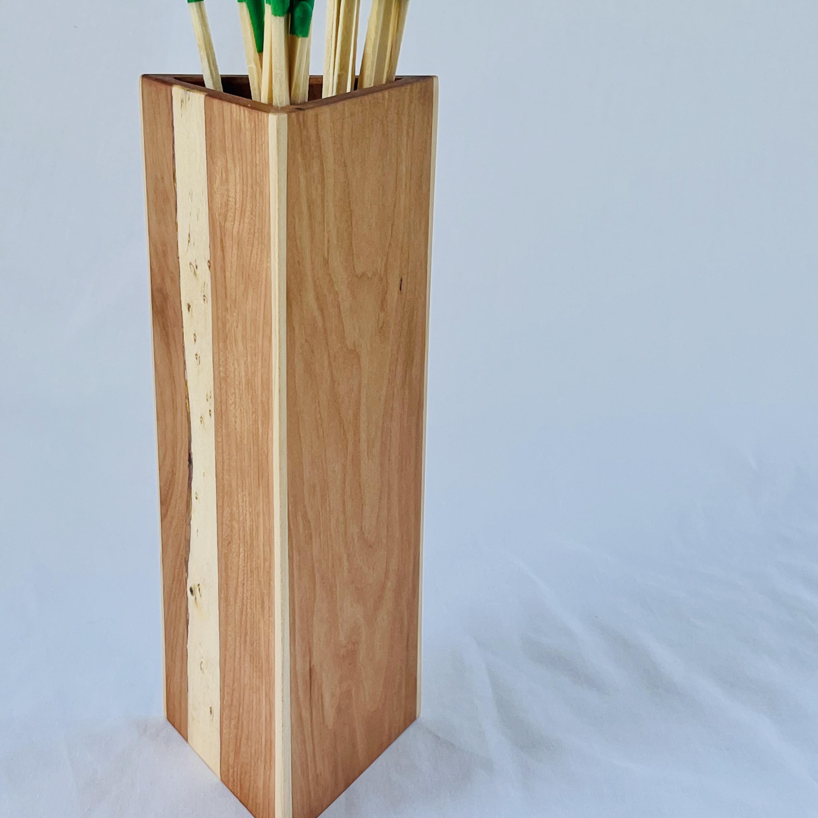 Far more attractive than the typical long, rectangular cardboard box used to hold fireplace matches, this triangular wooden box stands approximately ten inches tall, by four inches wide by three inches deep. Fireplace matches ten inches in length will fit perfectly in the box where a glued-in box bottom keeps the matches protruding slightly over top of the box so that a single match can easily be plucked.
