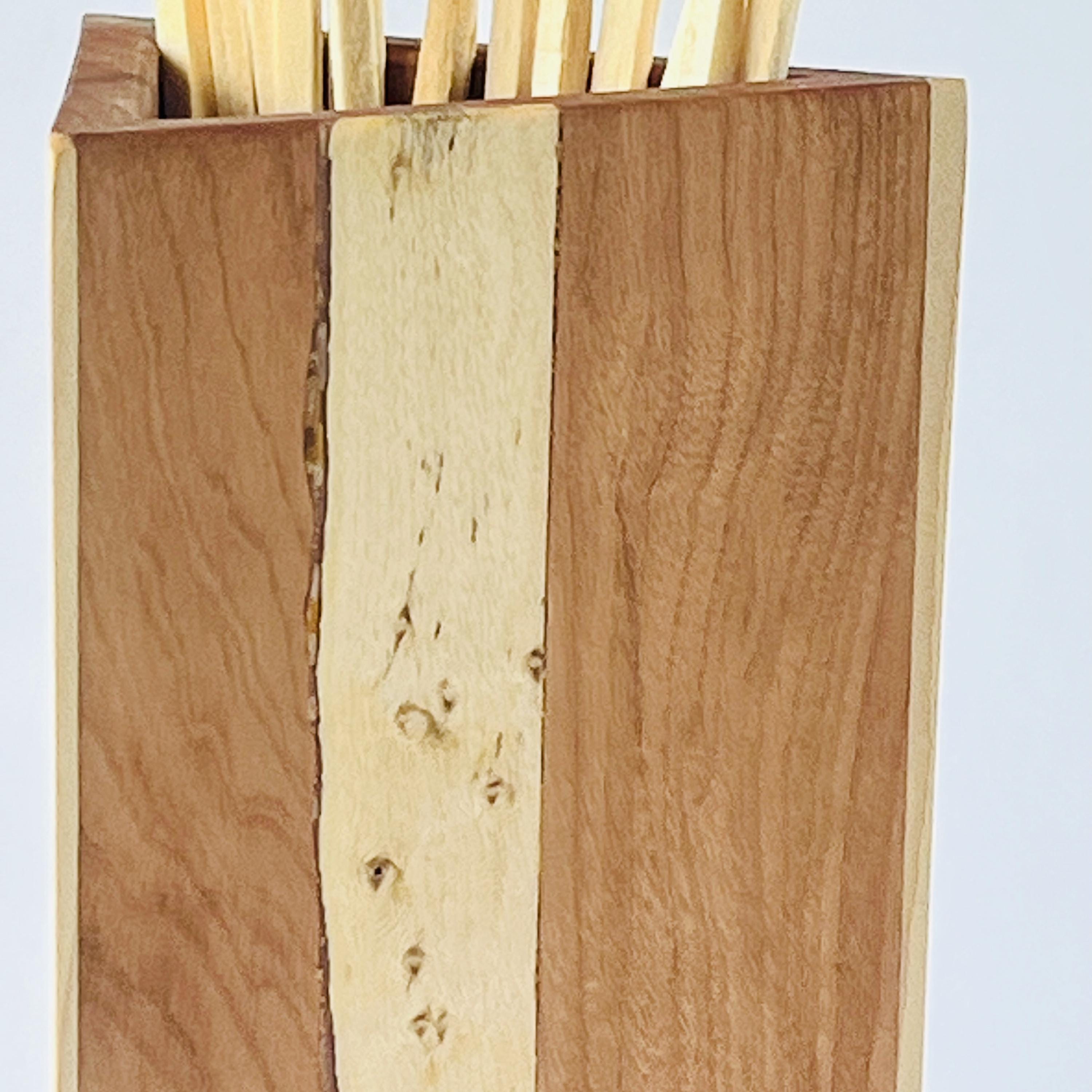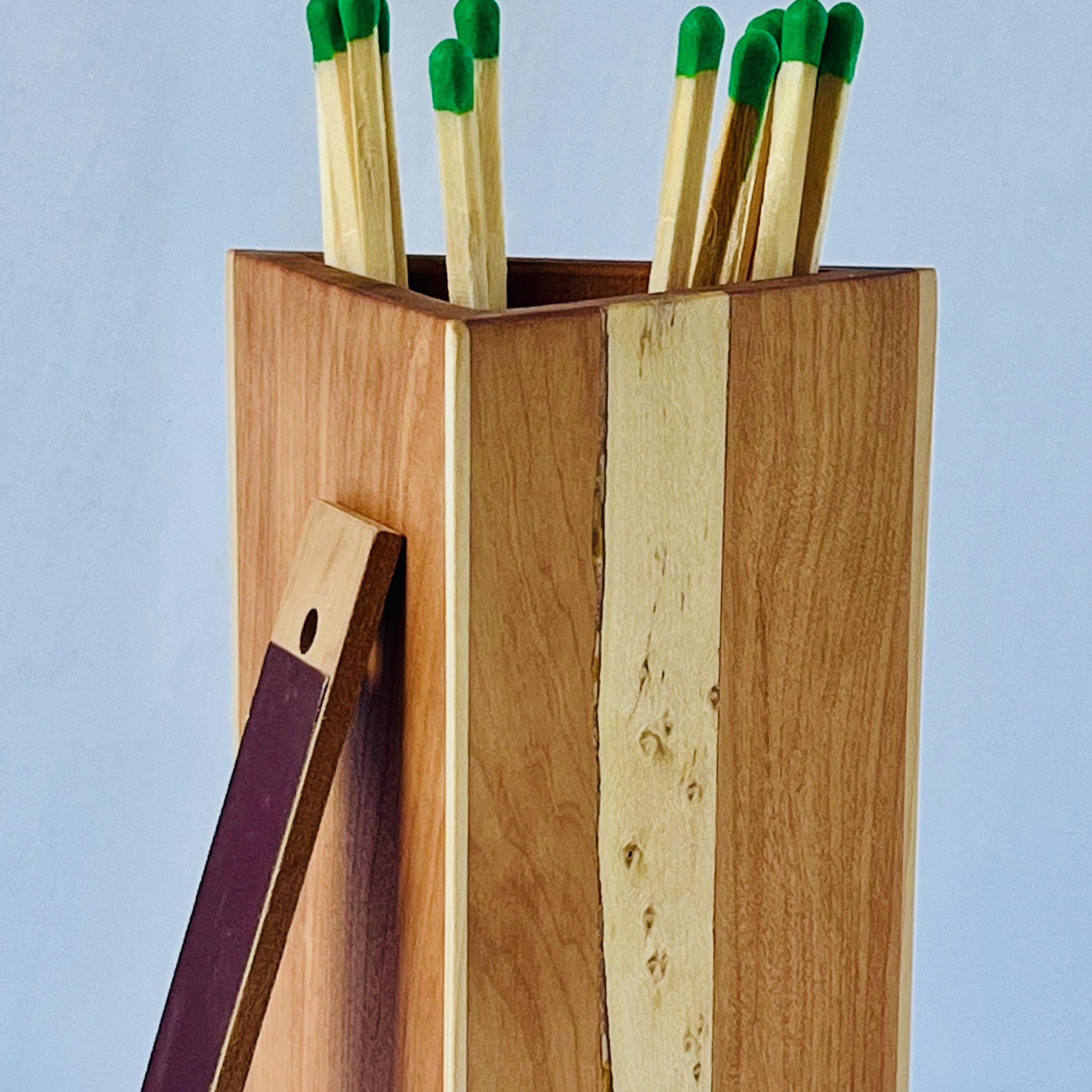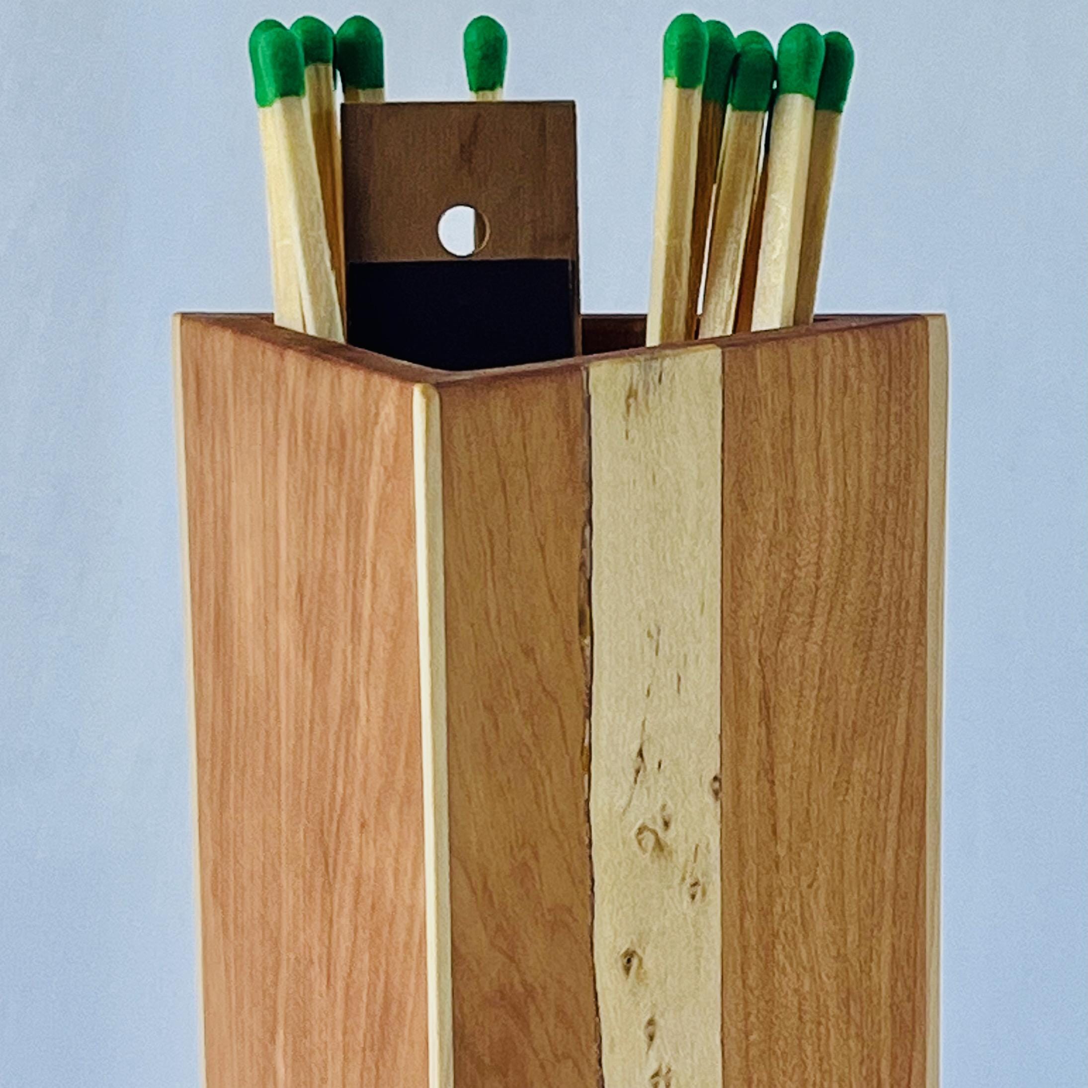 Warming up by the fire this winter will be even more cozy when your eye glances upon this unusual match box resting on your mantel. Handcrafted from solid cherry wood with solid maple edging at the three corners and a stunning inlaid accent strip of live edge birdseye maple, this box will comfortably keep more than twenty long stemmed fireplace matches close at hand. The included phosphorus-coated strike stick can be hung from a nearby nail or can nest inside the box if you prefer.