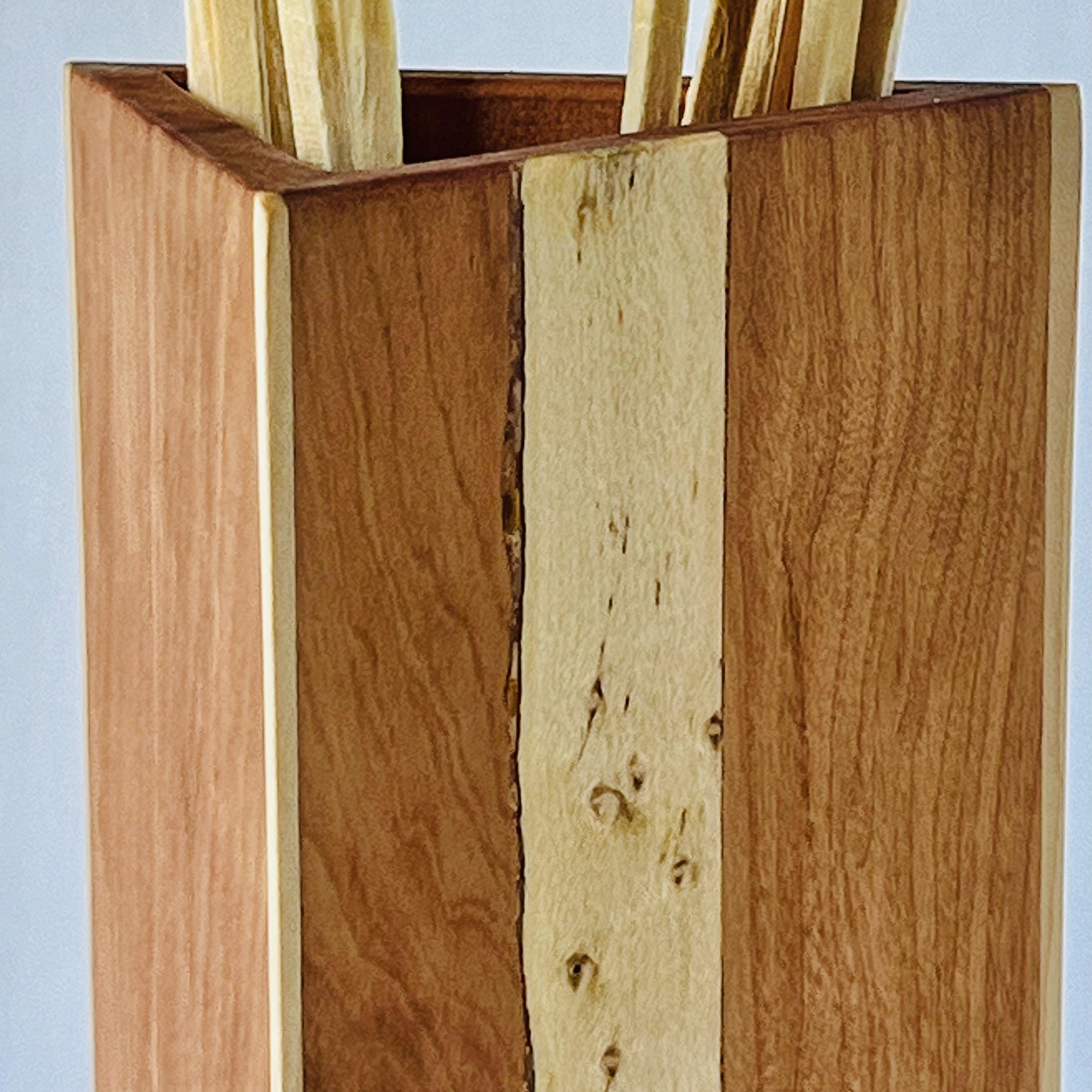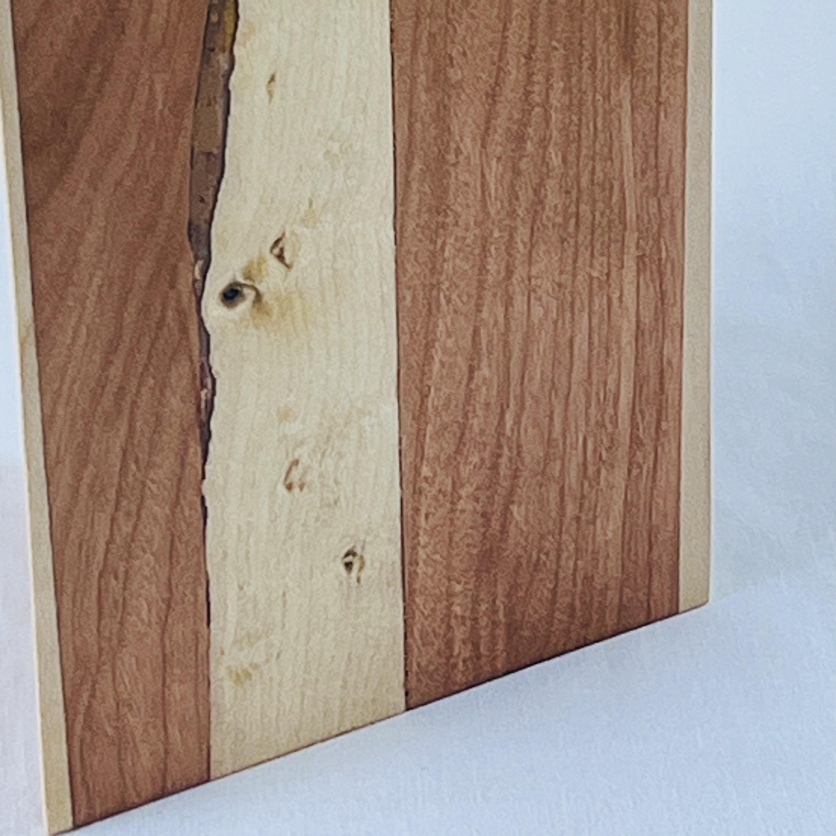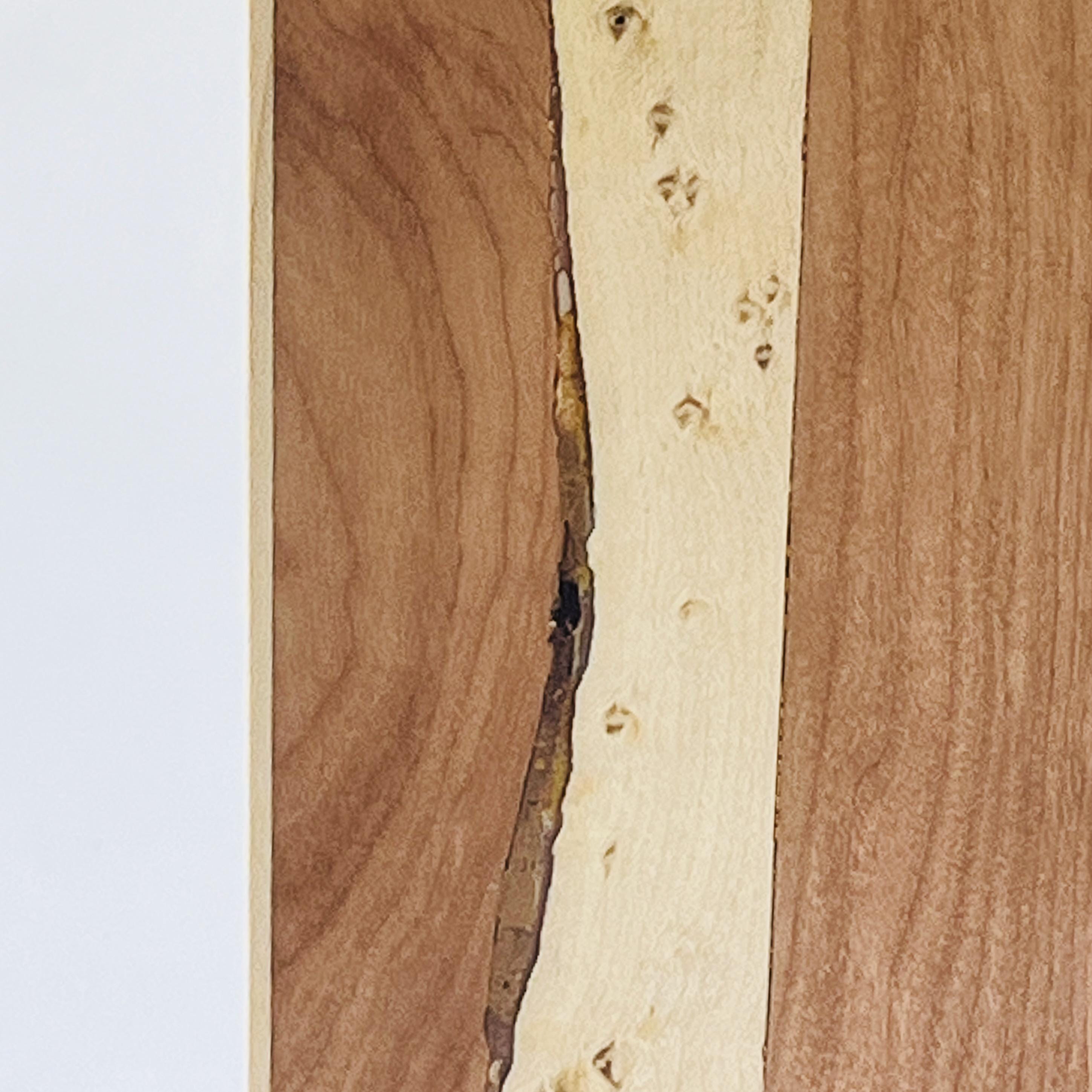 Warming up by the fire this winter will be even more cozy when your eye glances upon this unusual match box resting on your mantel. Handcrafted from solid cherry wood with solid maple edging at the three corners and a stunning inlaid accent strip of live edge birdseye maple, this box will comfortably keep more than twenty long stemmed fireplace matches close at hand. The included phosphorus-coated strike stick can be hung from a nearby nail or can nest inside the box if you prefer.