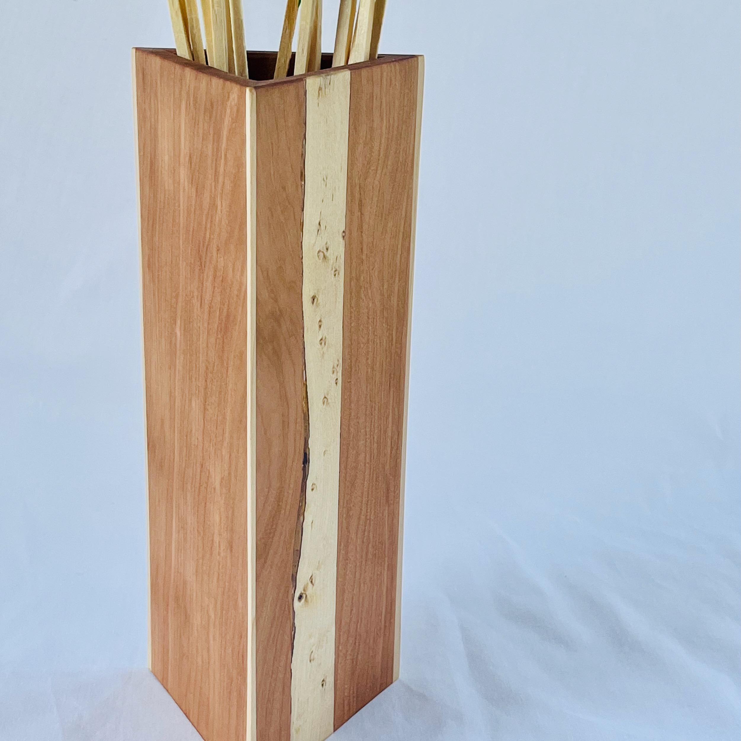 The triangularly shaped box and maple accents were carefully cut and fitted using hand-held tools and small shop machines. Similar boxes in a variety of wood selections will be available in my store, but these are photos of the exact box you will receive, with all the charming characteristics of the particular piece of cherry and live edge birdseye maple used to make this box.