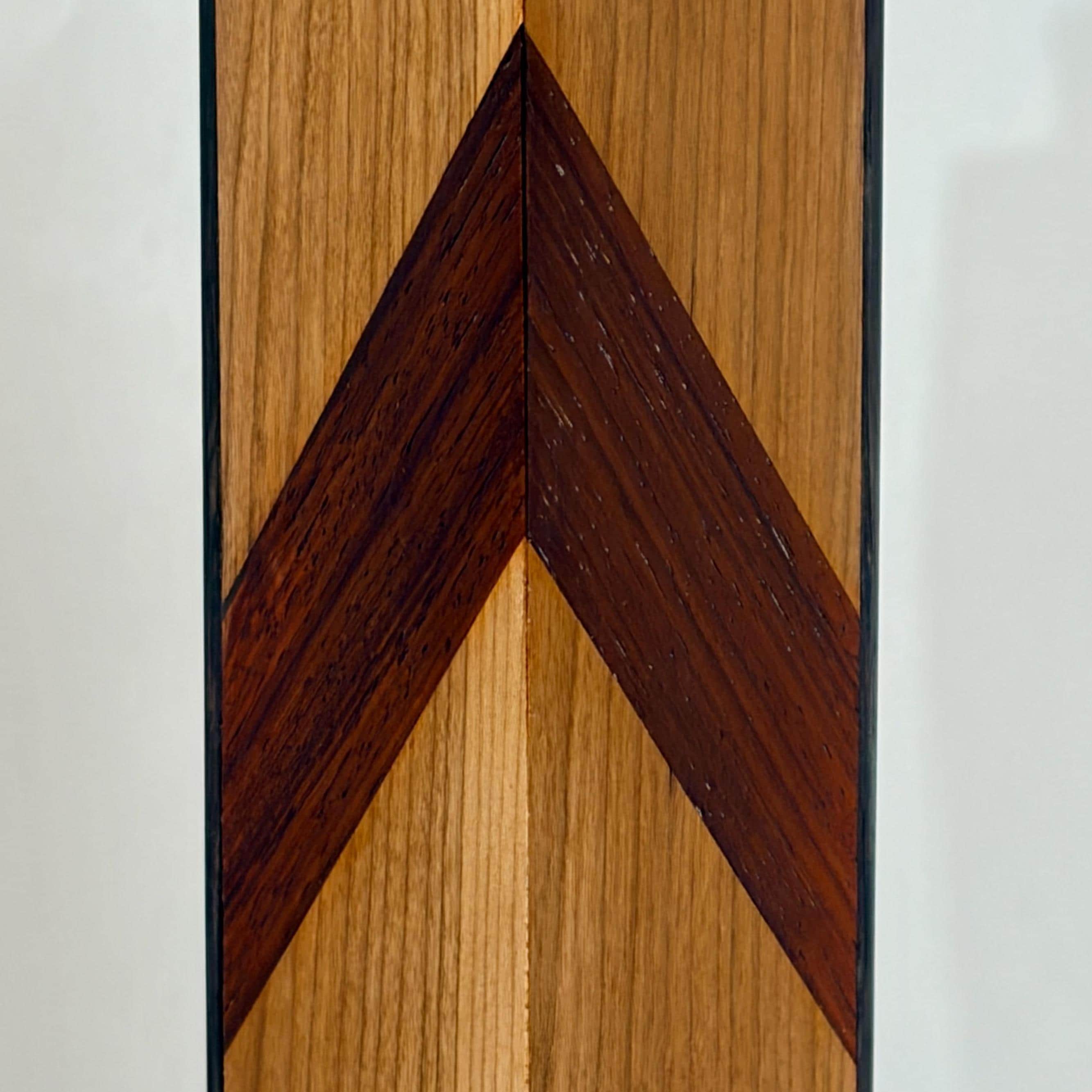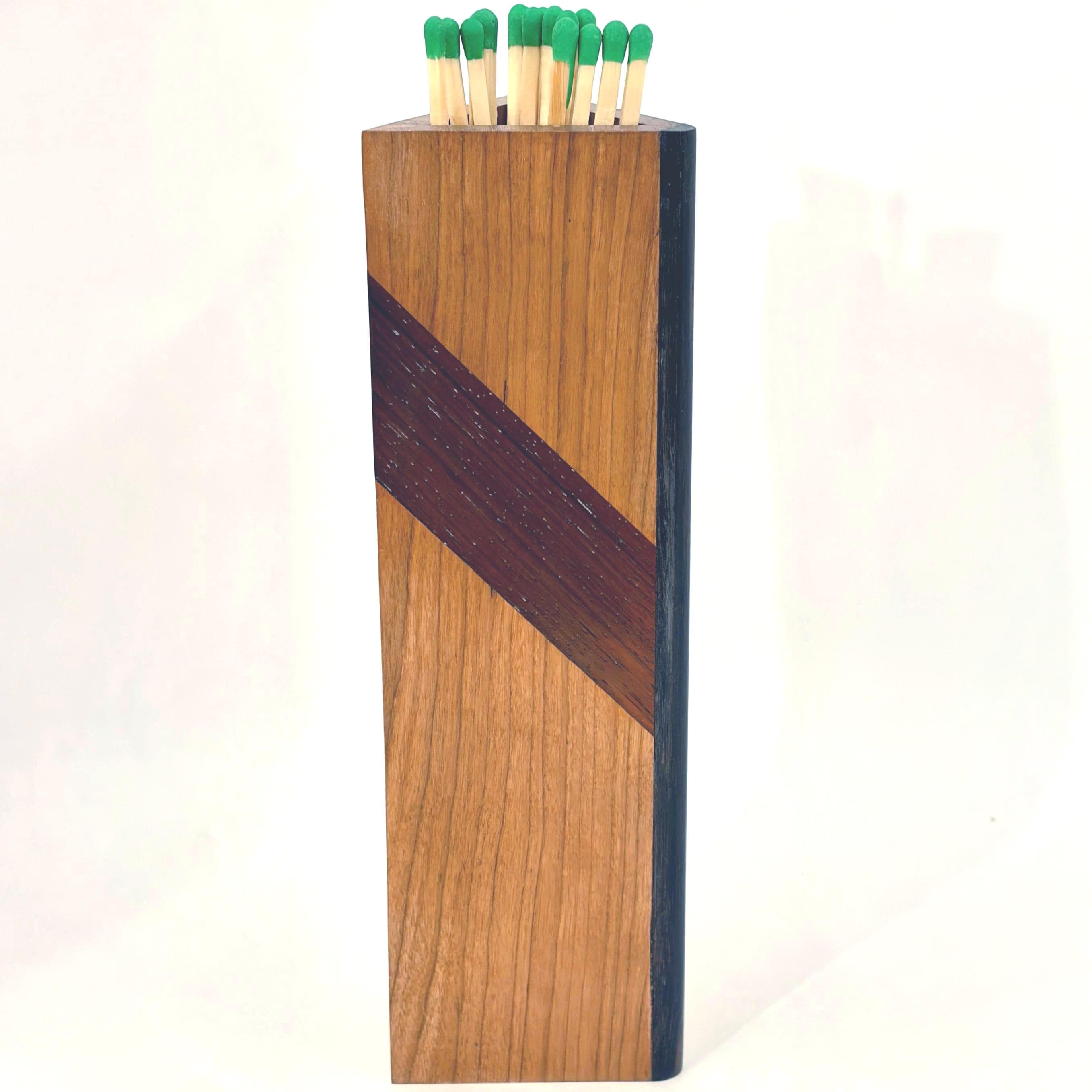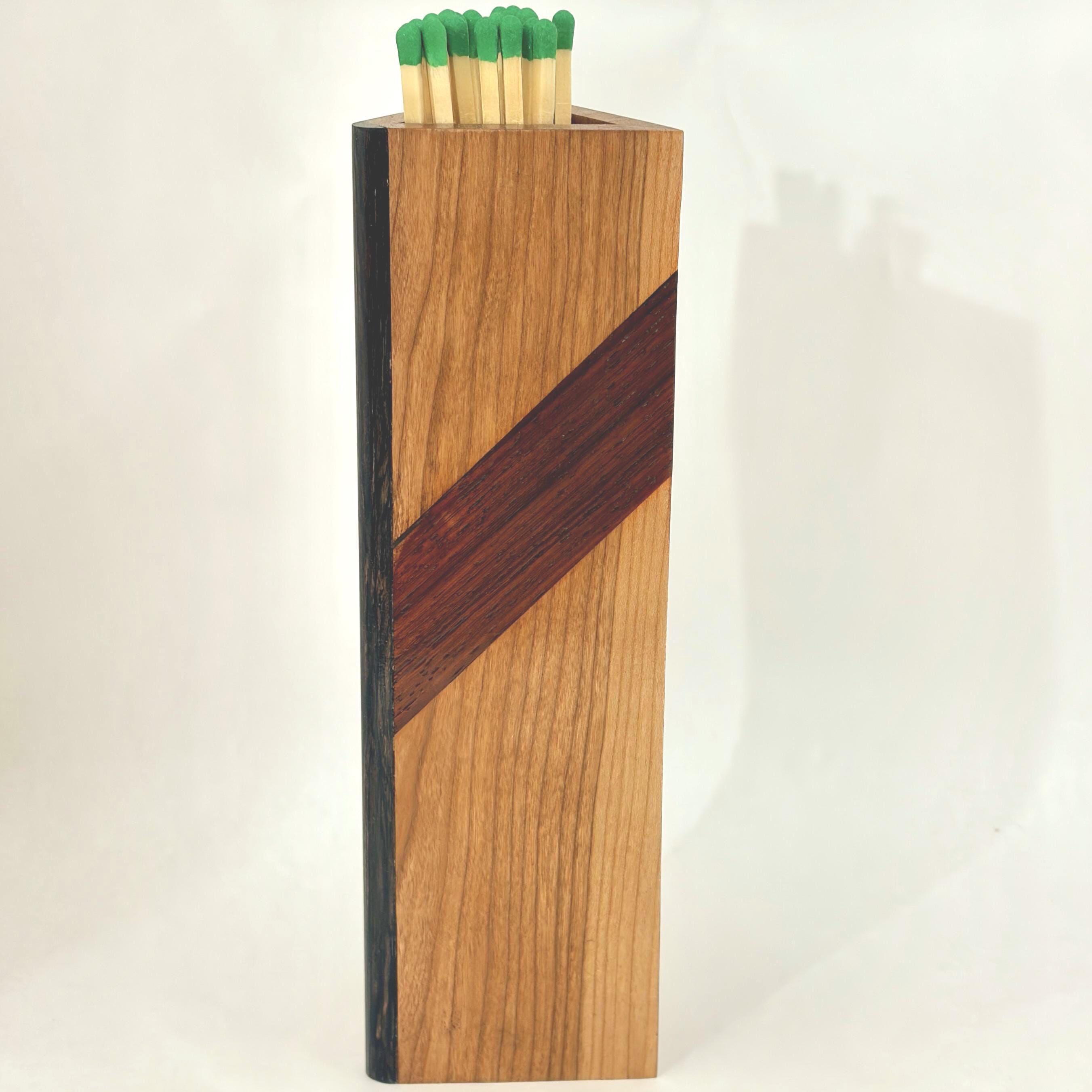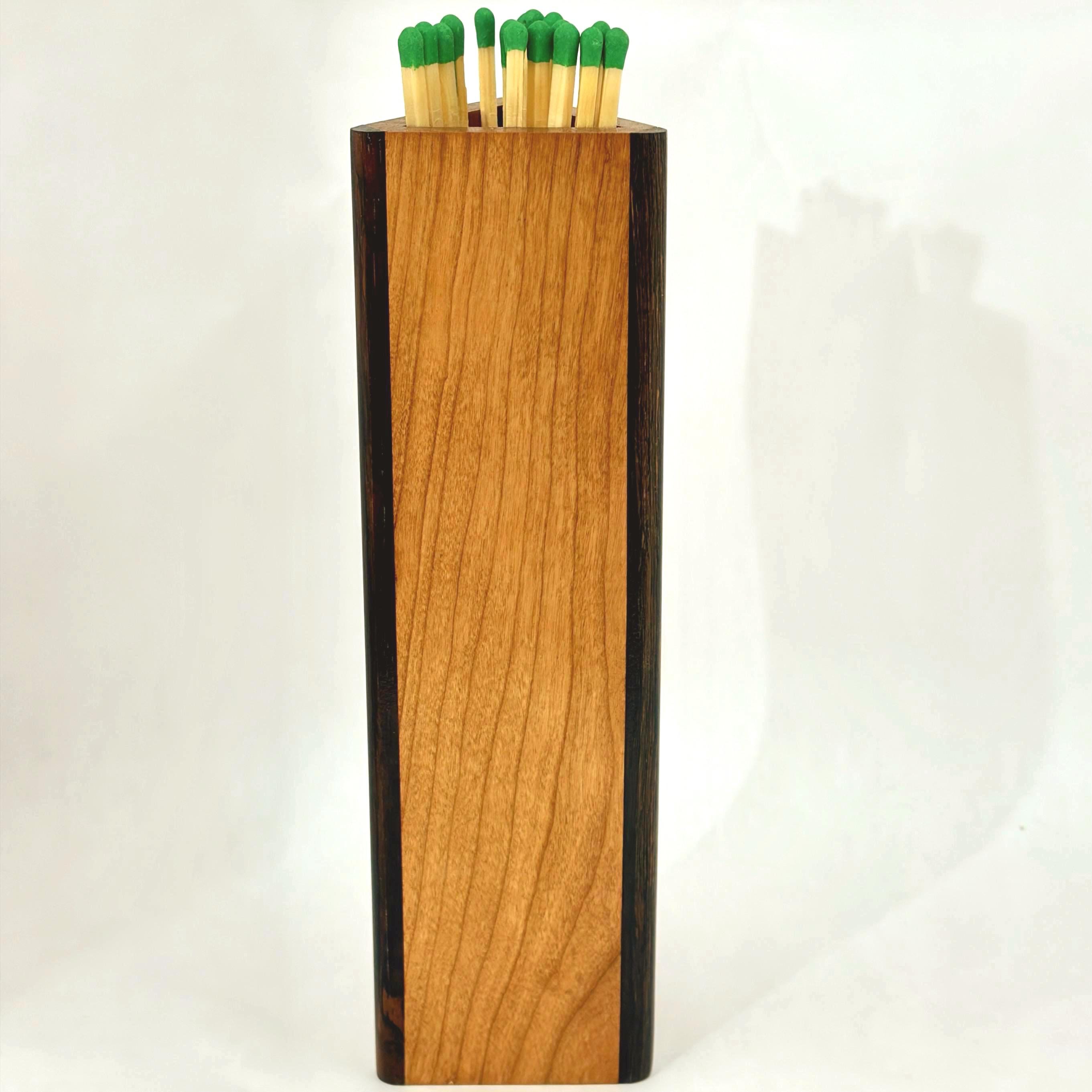 Warming up by the fire this winter will be even more cozy when your eye glances upon this unusual match box resting on your mantel. Handcrafted from solid cherry wood with solid macassar ebony edging at the two corners and a stunning inlaid accent strip of African padauk, this box will comfortably keep more than twenty long stemmed fireplace matches close at hand. The included phosphorus-coated strike stick can be hung from a nearby nail or can nest inside the box if you prefer.