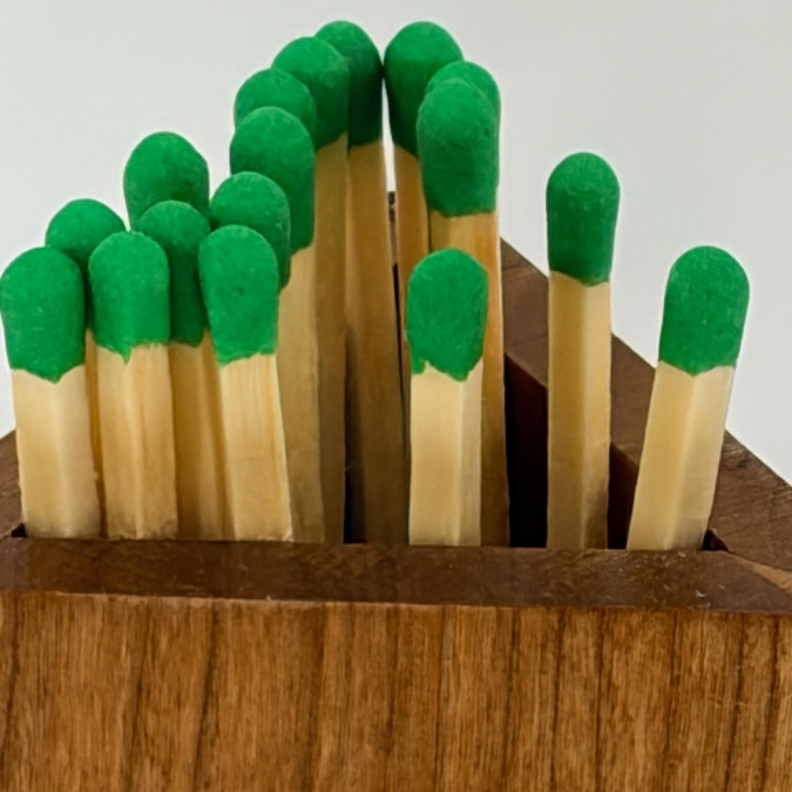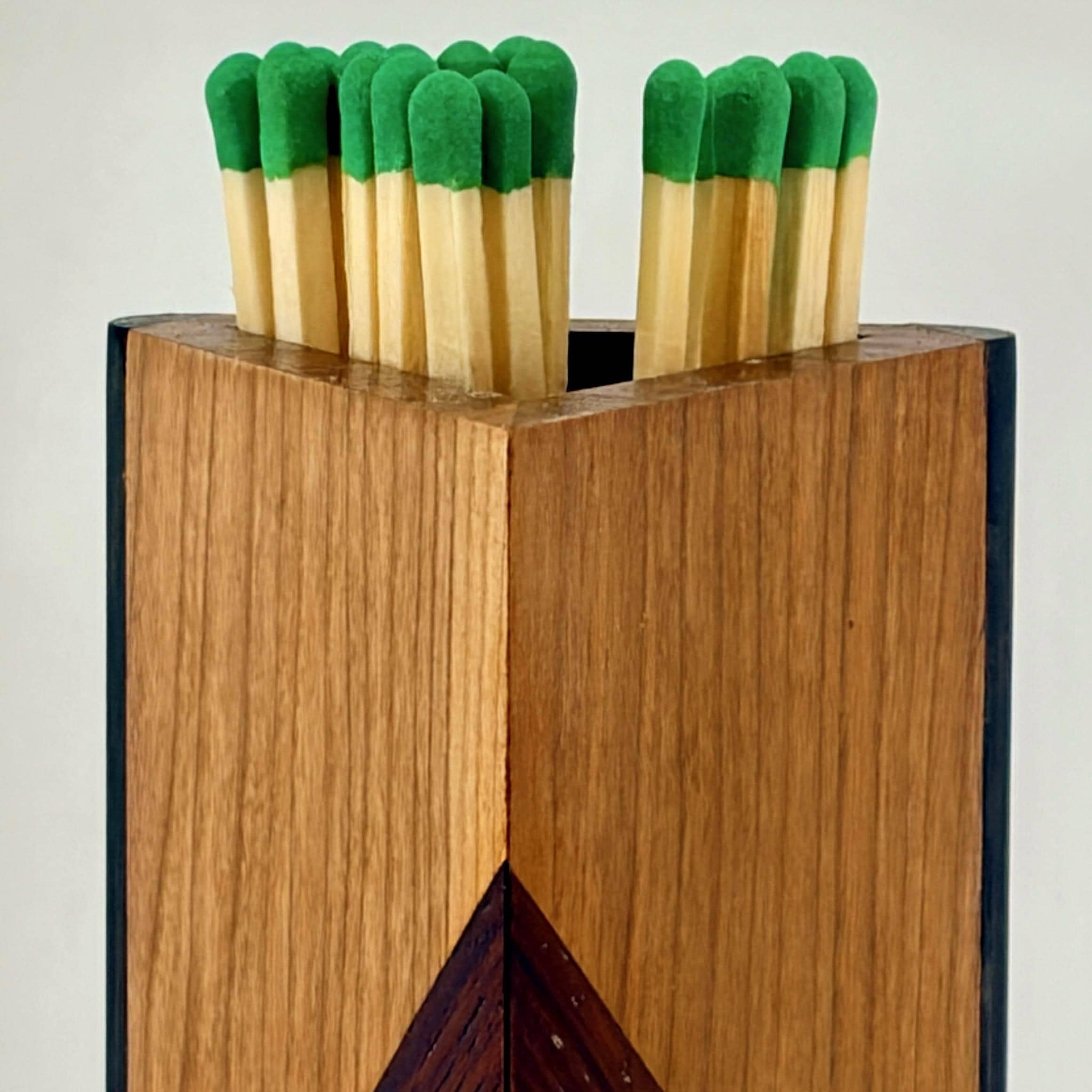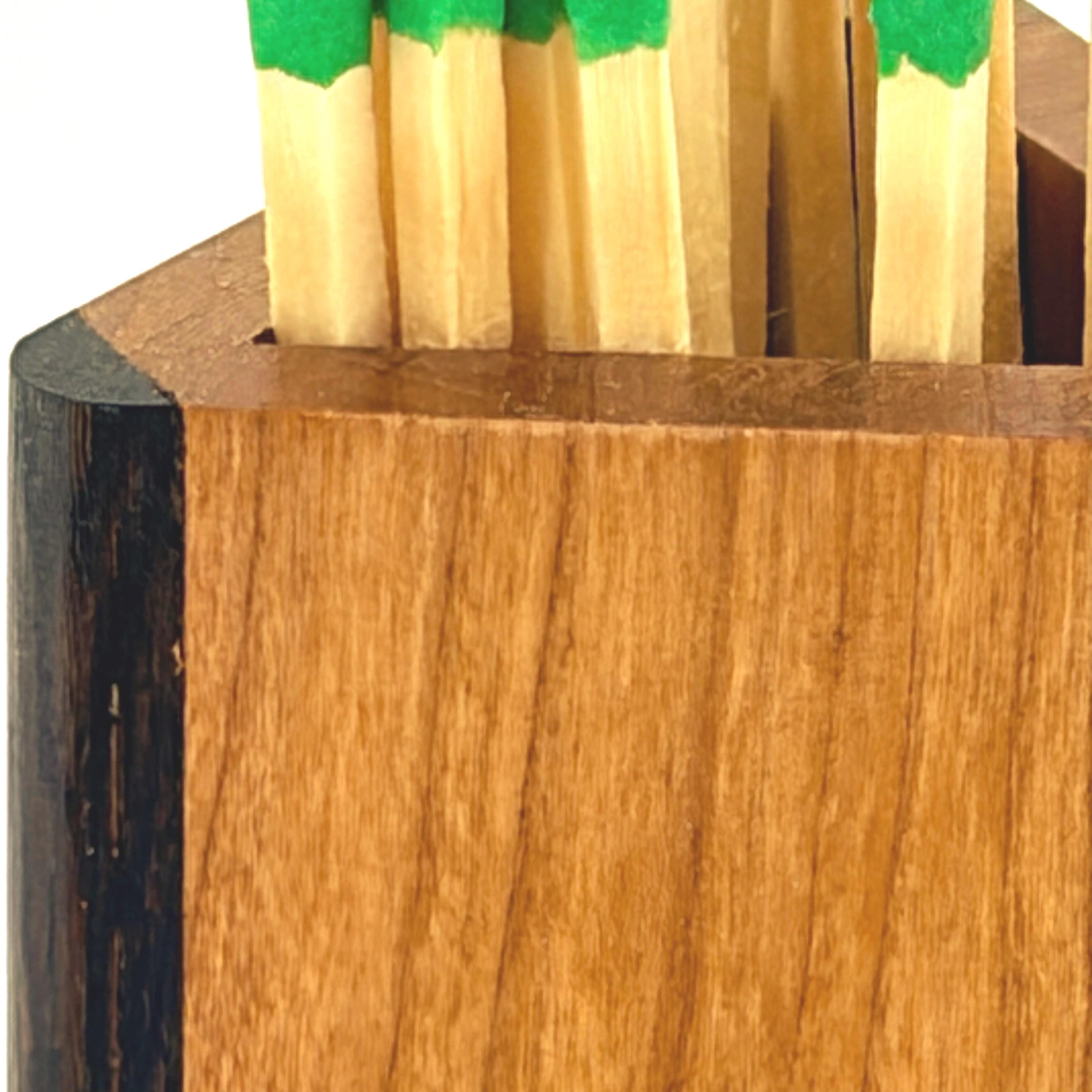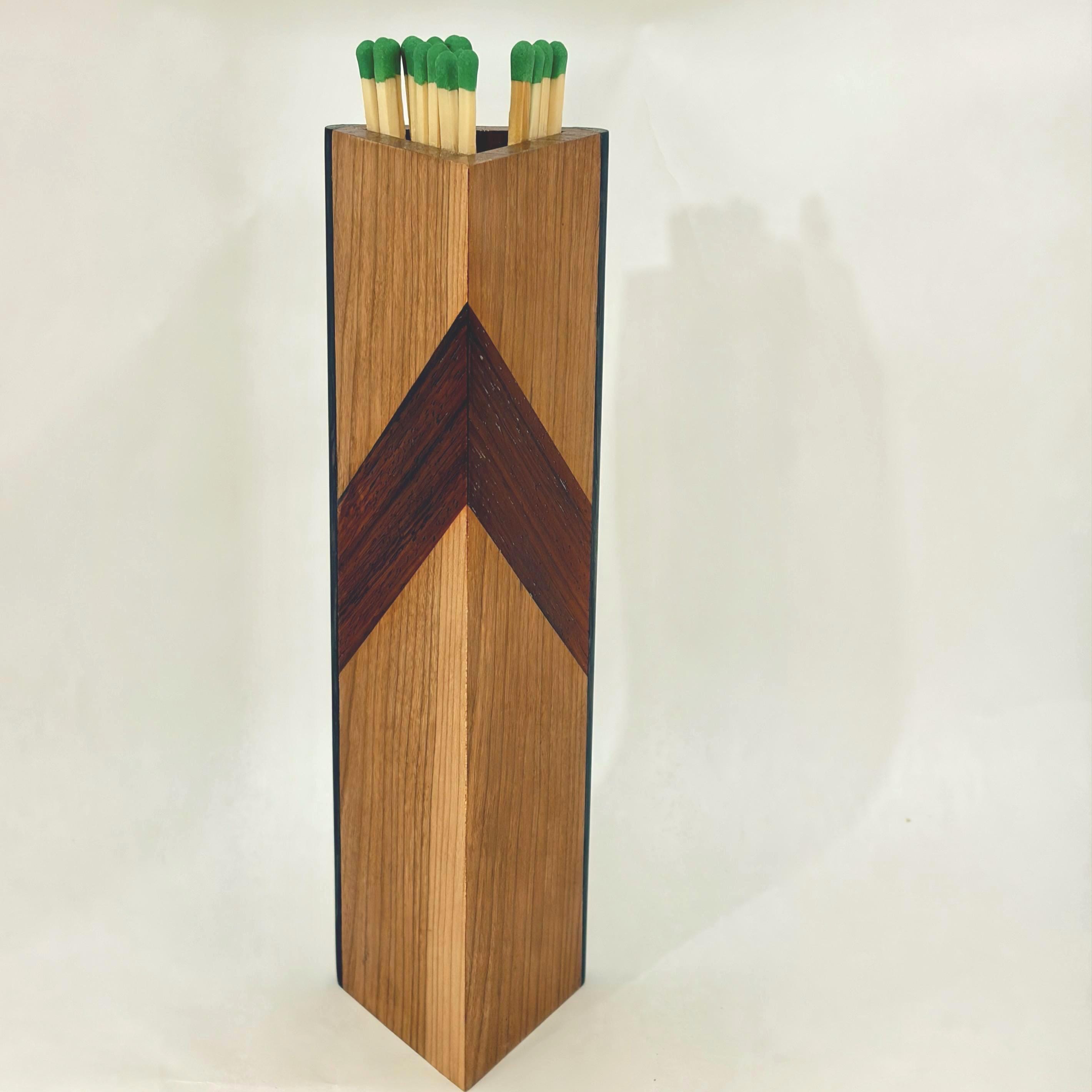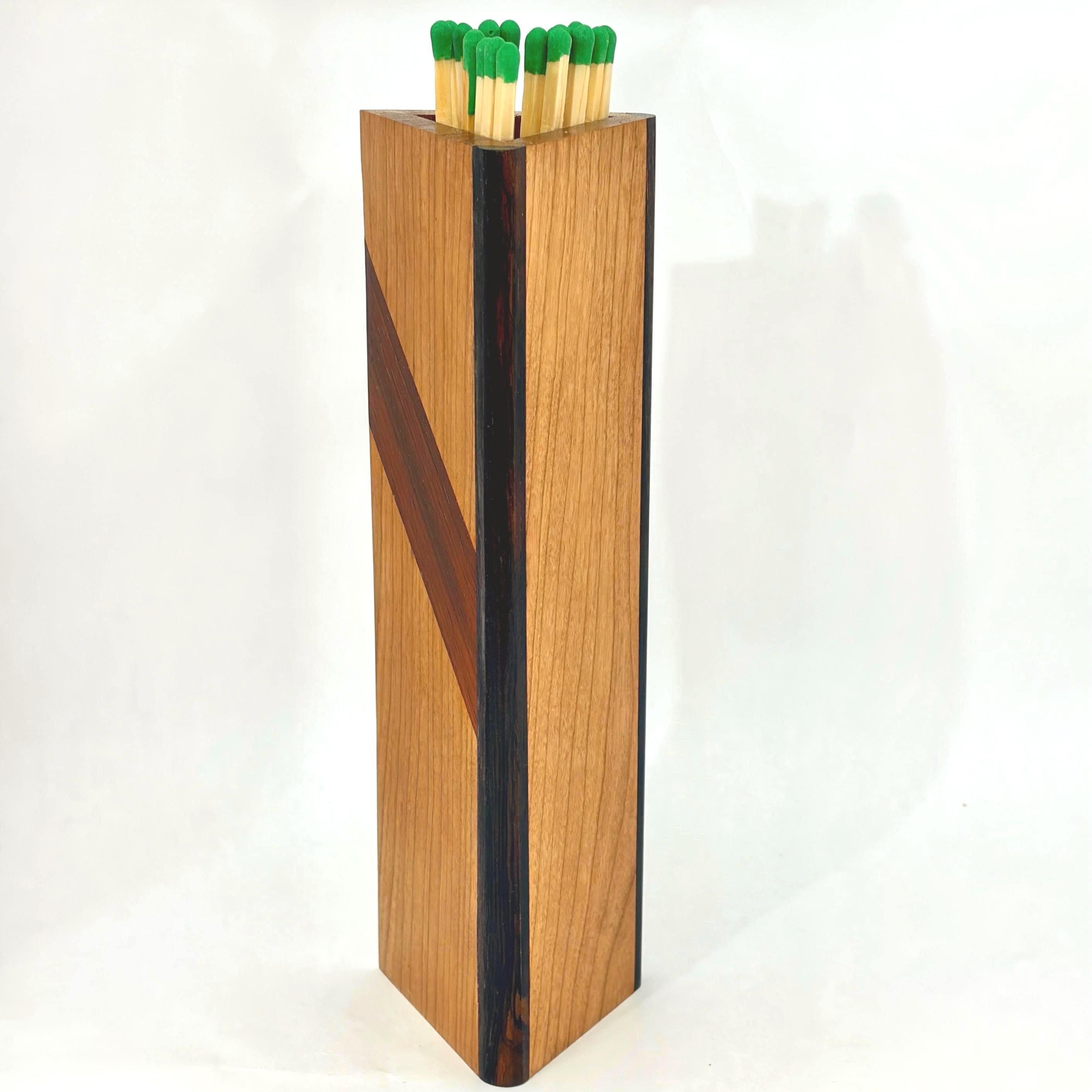 Far more attractive than the typical long, rectangular cardboard box used to hold fireplace matches, this triangular wooden box stands approximately ten inches tall, by three inches wide by three inches deep. Fireplace matches ten inches in length will fit perfectly in the box where a glued-in box bottom keeps the matches protruding slightly over top of the box so that a single match can easily be plucked.